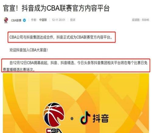 12月11日晚8点,CBA官方发布公告,宣布与抖音集团达成战略合作。